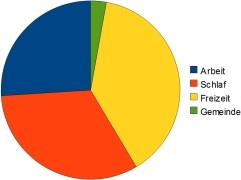 Da wäre als erstes die negative Einstellung zum „Alltag“ zu nennen. Ich höre in christlichen Kreisen oft, wie vom sogenannten „Alltag“ auf der einen Seite und vom Leben in der Gemeinde auf der anderen Seite gesprochen wird. Viele reden davon, dass wir in Gottesdiensten, bei Konferenzen oder ähnlichen Veranstaltungen mal wieder so richtig auftanken können – aber das impliziert ja die Vorstellung, dass wir während der Woche im Alltag leerlaufen, wie ein Auto. Ist es das eigentlich, wie Gott sich Christsein vorgestellt hat? Jesus hat uns versprochen, dass Er ein Leben in Fülle für uns hat, beschränkt sich das nur auf den Sonntag? Schleppen wir uns durch einen tristen, eintönigen, oft auch langweiligen Arbeitsalltag und haben nur einige schöne Stunden am Wochenende, wo wir das Leben genießen? Ist das nicht genau das, was uns die Welt vorlebt? Die Jugendlichen von heute schleppen sich durch die Woche und wenn man sie reden hört, hat man den Eindruck, dass sie nur am Wochenende so richtig lebendig sind, wenn es zur Party geht. Der „Alltag“ in der Woche ist mehr oder weniger ein notwendiges Übel. Und ich frage etwas provokant, ob wir dieses Muster nicht auch andeutungsweise in unserem Leben wiederfinden? Ich schließe mich da nicht aus. Wer kennt das nicht, dass die Arbeitstage oder Schultage viel zu lang sind und die Urlaubstage viel zu schnell vergehen? Hat Gott nicht mehr für uns parat? Sicherlich, aber es gibt einige Dinge, die wir uns bewusst machen sollten. Und zwar glauben wir ja an die Allgegenwart Gottes. Gott ist überall und immer da, 24 Stunden am Tag, 7 Tage die Woche, 365 Tage im Jahr, und Er will mit jedem von uns leben. Ich habe dazu mal ein Zeitdiagramm erstellt, wo man die durchschnittliche Zeitverteilung in einer Woche sehen kann.