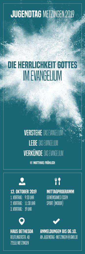 Als Josia-Netzwerk freuen wir uns, besonders unsere Freunde aus dem süddeutschen Raum auf den Jugendtag in Metzingen hinweisen zu dürfen. Unter dem Motto Die Herrlichkeit Gottes im Evangelium erwarten euch am Samstag, 12.10.2019 in der Gemeinde Haus Bethesda tiefgehende sowie lebensnahe Vorträge aus Gottes Wort, Indoor-Sport, ermutigende Gemeinschaft und gutes Essen.